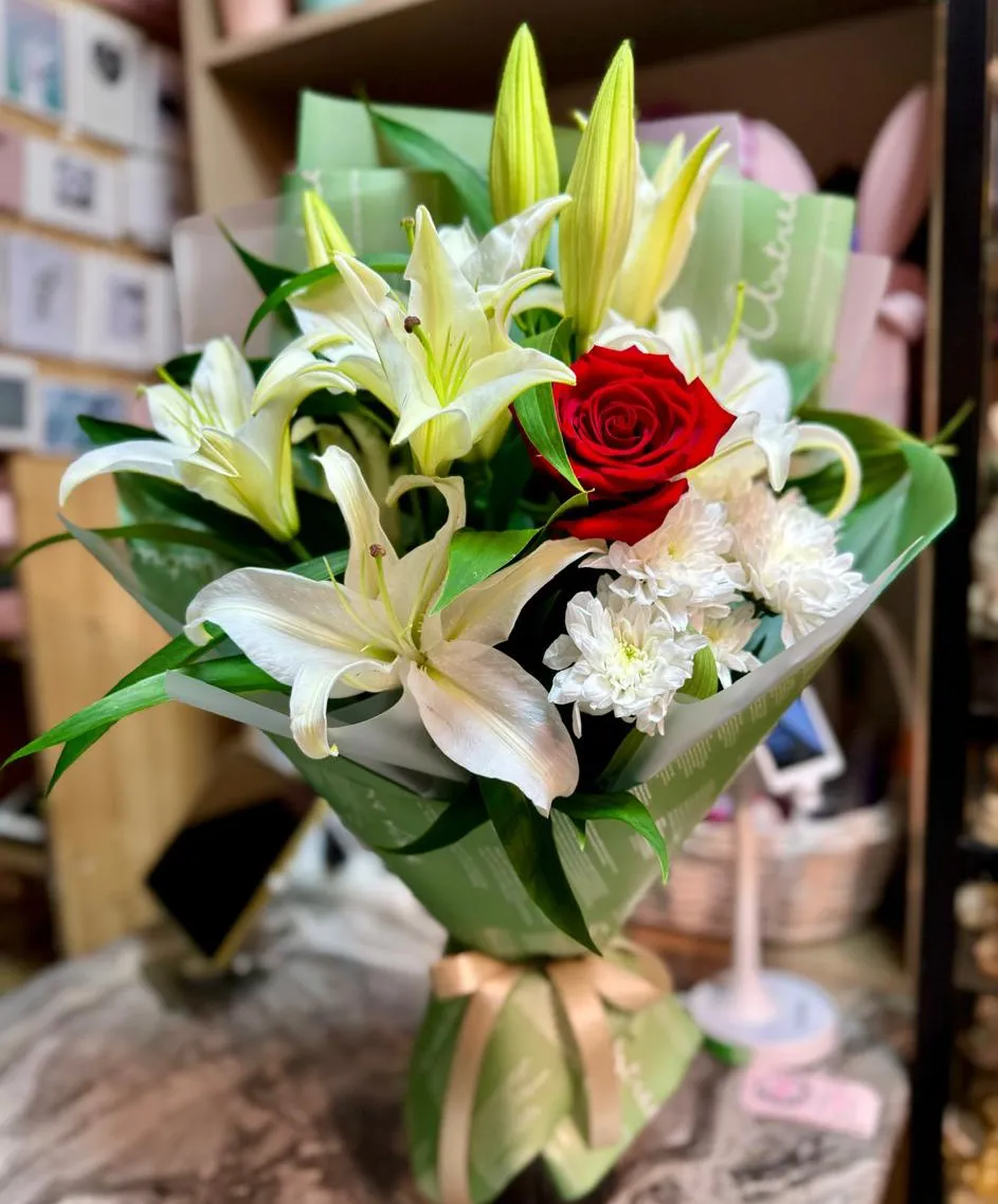 Лилии, роза, кустовая хризантема, упаковка, лента |
