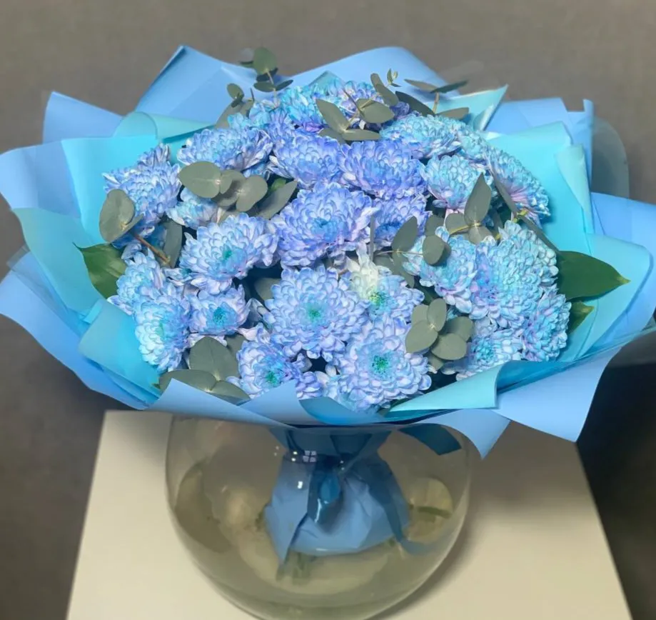 Букет из синих кустовых хризантем – это уникальное и стильное решение для создания уютной атмосферы в любом интерьере. Эти яркие цветы символизируют дружбу, верность и тепло, что делает их идеальными для подарка близким и друзьям. Синие хризантемы радуют глаз своей насыщенной окраской и пышными соцветиями.