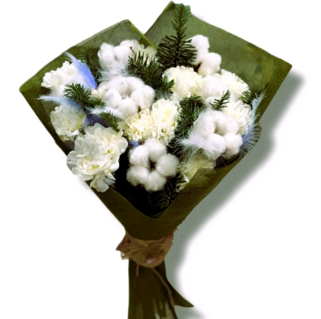 Диантусы, символизирующие красоту и нежность, добавляют букету очарования, в то время как хлопок придает ему уют и теплоту, ассоциирующиеся с зимними вечерами. Нобилис, с его зелеными пушистыми веточками, добавляет свежести и гармонии, делая композицию поистине неповторимой.