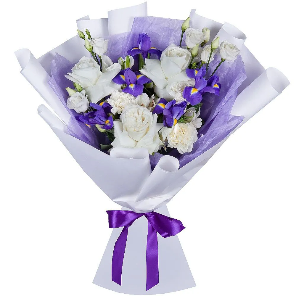 Вариант—Стандарт - ирис - 5 шт, роза - 3 шт, эустома - 1 шт, альстромерия - 2 шт, гвоздика - 3 шт, упаковка, лента