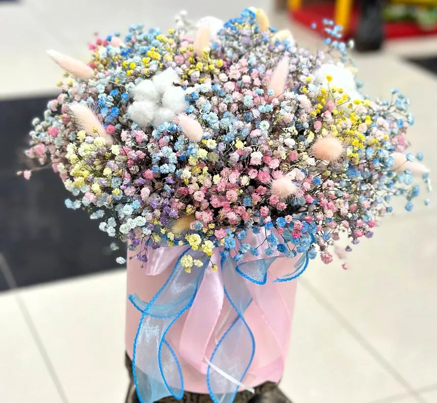 Шляпная коробка с радужной гипсофилой и декоративным хлопком – это идеальный подарок для ценителей красоты и утонченности. Яркая гипсофила в сочетании с мягким текстурированным хлопком создаёт уникальный и романтичный букет, который не оставит равнодушным никого. Праздничная атмосфера такого букета добавит нотку веселья и нежности в любой интерьер.