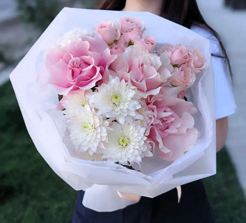 Французские розы - 3 шт., кустовые розы - 2 шт., кустовая хризантема - 1 шт., диантус - 1 шт., упаковка, лента