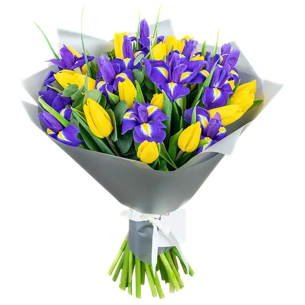 • Стандарт - тюльпан - 5 шт., ирис - 6 шт., зелень, упаковка, лента