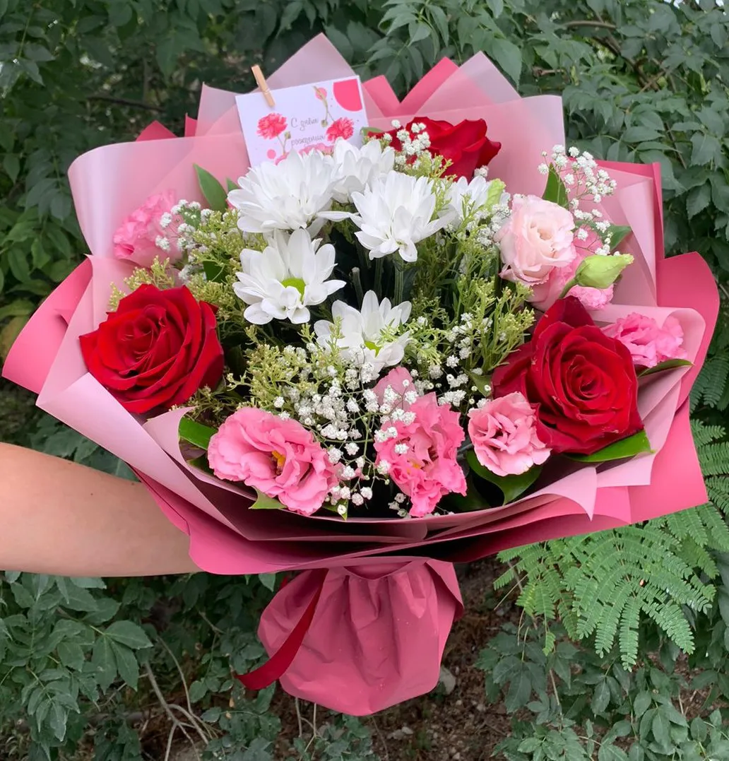 • Стандарт - роза - 3 шт., Эустома - 2 шт., хризантема - 1 шт., гипсофила, упаковка, лента