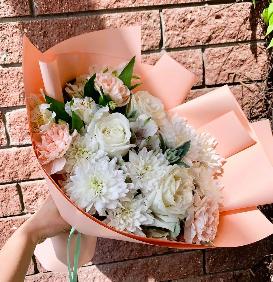Букет из белых роз, хризантем, альстромерий и гвоздики — это великолепное сочетание, наполненное нежностью и элегантностью. Белоснежные розы, с их бархатистыми лепестками, олицетворяют чистоту и настоящую любовь. Их изысканная форма и легкий аромат делают этот букет поистине уникальным, каждое распущенное бутон словно шепчет о нежных чувствах и привязанности.